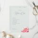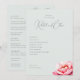 This wedding program features a minimalist and elegant design with a soft pastel color palette of light mint green and blush pink. The layout is balanced, with ample negative space around the flowing cursive script for names and a clean serif font detailing the ceremony schedule. A large, detailed watercolor-style peony flower adds a touch of natural elegance to the bottom right corner, enhancing the romantic and refined theme. Perfect for a formal event, this design conveys a serene and sophisticated atmosphere, ideal for celebrating love and commitment.