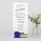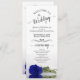 Ce magnifique programme de mariage présente un design élégant avec un seul rose à longue tige bleu royal vif ou couleur cobalt sur son côté réfléchissant dans l'eau. Les titres sont écrits en calligraphie de script sophistiquée, et il y a de l'espace pour vos détails de cérémonie et de mariage, ainsi qu'un bref merci pour vos invités. Merveilleuse façon d'accueillir vos amis et votre famille à votre fête mariage.