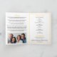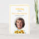 Un beau et élégant programme de funérailles plié orné de feuilles vertes de eucalyptus et de tournesols jaunes simples et élégants.