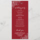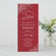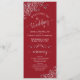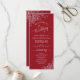 Ce magnifique programme de mariage présente un design élégant avec du texte blanc sur un arrière - plan rouge crimson et des boucles et tourbillons en faux feuille gris argent dentée dans les coins. Les titres sont écrits en calligraphie de script sophistiquée, et il y a de l'espace pour vos détails de cérémonie et de mariage, ainsi qu'un bref merci pour votre invité. Merveilleuse façon d'accueillir vos amis et votre famille à votre fête mariage.