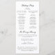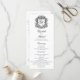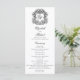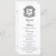 Cet élégant programme de mariage noir et blanc présente une crête ornée au sommet avec les initiales monogrammes de la mariée et du marié en caractères de script formel fantaisie.