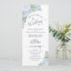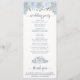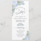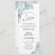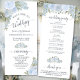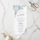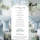 Ce magnifique programme de mariage présente un élégant design chic boho floral avec des roses peints à la main et des fleurs dans les tons bleu pâle et poussiéreux, entouré de délicats sprigs verts sauge de feuilles eucalyptus et de verdure de jardin. Les titres sont écrits en calligraphie de script sophistiquée, et il y a de l'espace pour vos détails de cérémonie et de mariage, ainsi qu'un bref merci pour votre invité. Merveilleuse façon d'accueillir vos amis et votre famille à votre fête mariage.