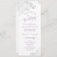 Ce magnifique programme de mariage présente un design élégant avec du texte pourpre ou lavande poussiéreux sur un arrière - plan blanc et des boucles et des tourbillons en faux feuille gris argent en dentelle dans les coins. Les titres sont écrits en calligraphie de script sophistiquée, et il y a de l'espace pour vos détails de cérémonie et de mariage, ainsi qu'un bref merci pour vos invités. Merveilleuse façon d'accueillir vos amis et votre famille à votre fête mariage.