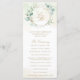 Programme de mariage moderne avec votre deux monogramme d'entrelacement initial à l'intérieur d'un cadre géométrique en faux or entouré de feuilles d'eucalyptus et de verdure, sur un lavage pastel aquarelle. Le côté avant a vos cérémonies et le côté arrière a votre fête de mariage et message de remerciement. Cet élégant design rustique est idéal pour un mariage à thème botanique en été.