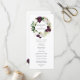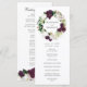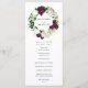 Élégant programme de mariage floral avec vos noms encerclés par une couronne de fleurs de prune foncé violet et blanc à l'aquarelle avec feuille d'or faux rose et feuilles verts. Personnalisez les programmes de mariage floral en ajoutant votre date et emplacement mariage, l'ordre des événements et la fête de mariage au dos. Conçu pour coordonner avec notre collection de mariages floraux de prune foncée.