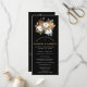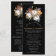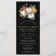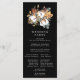 Des fleurs d'automne rustiques créent une frontière élégante pour ce modèle de programme de mariage. Des fleurs de coton blanches et vives sont nichées dans des feuilles marron doré profond, des sprigs À feuillage persistant et des glands ajoutent une touche de saison. Le texte blanc et le graphique pop sur l'arrière - plan noir. Il y a beaucoup de place pour vous d'inclure les moments importants de votre propre cérémonie de mariage et d'honorer vos participants mariages. Ce programme de mariage fait partie de la collection Cotton et Feuille d'automne qui contient de nombreux éléments de coordination tels que des panneaux d'accueil mariages et des cartes de numéro de table.