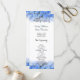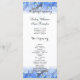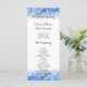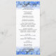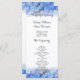Programme de cérémonie de mariage à fleurs bleues. Customisez les deux côtés de cette carte de mariage frontalier d'hydrangea et listez l'ordre de la cérémonie d'un côté et les noms des familles et des mariages à l'arrière. Le texte noir est en style de script et de police imprimée et est facile à lire. Les cartes abordables mesurent 4 x 9 pouces.