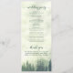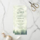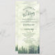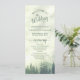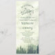 Ce magnifique programme de mariage présente un design rustique mais élégant, avec un paysage aquarelé de montagnes recouvertes de pins verts, noyés dans la brume ou le brouillard. Les titres sont écrits en calligraphie de script sophistiquée, et il y a de l'espace pour vos détails de cérémonie et de mariage, ainsi qu'un bref merci pour vos invités. Merveilleuse façon d'accueillir vos amis et votre famille à votre fête mariage.