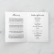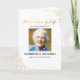 Programme de célébration de la vie avec un arrière - plan blanc élégant qui peut être changé à n'importe quelle couleur, sur la couverture d'avant une photo du défunt, leur nom, les dates, et la parties scintillant d'or. A l'intérieur se trouve une nécrologie, un ordre de service, et au fond une note de remerciement et les détails de la réception.