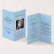 Un programme élégant de 4 pages. Un arrière - plan bleu. Personnalisez et ajoutez une photo, un nom, des dates et votre texte. Des rayons de lumière blanche derrière la photo.