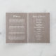 Programme de célébration de la vie avec un arrière - plan rustique en bois, sur la couverture de devant une photo de la personne qui est décédée, leur nom, leurs dattes, et tournesols jaune vif. A l'intérieur se trouve une nécrologie et un ordre de service; au verso une note de remerciement et les détails suivants.