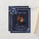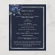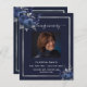 Un programme élégant de 2 pages. Un arrière - plan bleu foncé, un cadre faux argenté, des fleurs bleues et un espace pour une photo. Personnalisez et ajoutez le nom, les dates et votre texte.