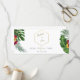 Mariage Seating Carte avec design tropical, feuilles de palmiers verdoyants, jaune & rouge floral et or géométrique.