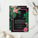 Une botanique tropicale néon rose moderne et rétro sur un arrière - plan noir. Un beau design mariage idéal pour l'été. Design plante tropical néon rose parfait avec palmiers, fleurs d'Hibiscus roses et fleurs de Plumerias Frangipanis. Les couleurs noir, rose et vert dominent ce néon rose tropical. La typographie calligraphique moderne contraste parfaitement avec le design mariage noir et rose. Un design élégant et élégant de carte de programme de mariage avec des éléments simples et modernes. Des articles de papeterie mariage correspondants et d'autres formats d'invitation de mariage sont également disponibles.