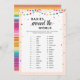 Joli jeu de baby shower à thème fiesta avec des lumières à cordes colorées et des confettis. Le jeu de baby shower est "babies around the world" où vous mettez le mot pour bébé en correspondance avec la langue. Amusant pour tous les baby showers !