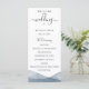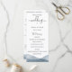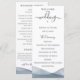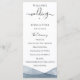 Bordures élégantes et modernes peintes à l'aquarelle bleue en dégradé, programme de mariage. Le programme comprend une calligraphie mignonne accentuée de "mariage" avec plusieurs lignes pour des listes de texte personnalisées pour l'ordre des événements de la cérémonie, le cortège de mariage et le mot de remerciement.