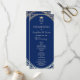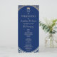Simple, moderne, élégant, calligraphie programme de mariage bleu marine avec cadre art déco or et monogramme royal au sommet.
