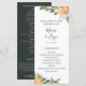 Élégant mariage rustique dans un verger d'agrumes botaniques, programme de mariage. Texte modèle liste pour l'ordre des événements de la cérémonie, cortège de mariage et note de remerciement. La couleur de fond montrée en vert chasseur foncé coordonnant, peut être personnalisée.
