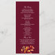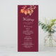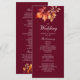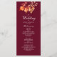 Cette carte de programme de mariage d'automne élégante présente un fond bordeaux profond avec des feuilles d'automne aquarellées en rouge riche, orange et or. La mise en page verticale permet d'afficher facilement les détails de votre cérémonie, les lectures et les sélections musicales dans un format clair et classique. Parfait pour les mariages de septembre, octobre ou novembre avec un thème romantique, rustique ou saisonnier.