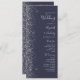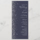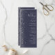 Le bord gauche de cet élégant programme de mariage moderne présente un style de parties scintillant en faux argent. Le texte personnalisable combine écriture gris argenté, copperplate et polices italiques sur un arrière - plan bleu marine foncé.