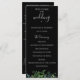 Végétation botanique moderne aquarelle, programme de mariage noir. Le programme comporte plusieurs lignes pour des listes de texte personnalisées pour l'ordre des cérémonies, la fête de mariage et la note de remerciement.
