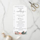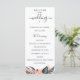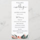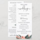 Tropiques modernes fleurs roses de corail peintes et feuillage vert luxuriant, programme de mariage. Le programme comporte un accent de calligraphie mignonne "mariage" avec plusieurs lignes pour les listes de texte personnalisées pour l'ordre des événements de la cérémonie, la fête de mariage et le mot de remerciement.