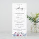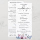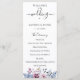 Élégantes fleurs aquarelles bleu poussiéreux et mauve et feuillage, programme de mariage. Le programme présente une calligraphie mignonne accentuée de "mariage" avec plusieurs lignes pour des listes de texte personnalisées pour l'ordre des événements de la cérémonie, le cortège de mariage et le mot de remerciement.