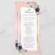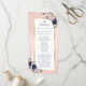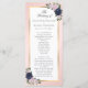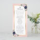 Élégant programme de mariage bleu marine et floral roux avec fleurs bleues et roses rousses et verdure encadrant les détails mariages dans un cadre doré. Éléments correspondants disponibles.