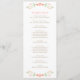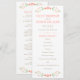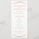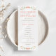 De charmants brins floraux de style folklorique en pêche douce, corail et vert encadrent ce programme de cérémonie plat fantaisiste sur un fond blanc propre. Vos noms, date et ordre complet de la cérémonie sont présentés en typographie pêche chaude avec un séparateur à accent de point ludique. Le dos présente votre cortège de mariage et un remerciement. Entièrement personnalisable des deux côtés.