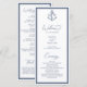 Ce programme de mariage nautique élégant présente un monogramme d'ancre en haut avec les initiales de la mariée et du marié, avec un double cadre bleu marine, un fond blanc et un texte élégant classique bleu marine avec calligraphie script.
