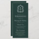 Cet élégant programme de mariage d'inspiration vintage comprend une paire d'initiales en monogramme blanc en police serif ouverte au-dessus et au-dessous d'une ligne de séparation et entourée d'une crête botanique d'art sur un arrière - plan vert de forêt foncée.