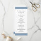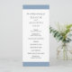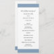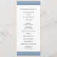 Programme moderne de mariage bleu poussiéreux avec une bande audacieuse en haut et en bas. Vos noms sont dans une police serif classique et vos détails sont dans une combinaison d'une police sans serif moderne et d'un script élégant. Le dos a une bande le long du fond avec votre monogramme. Cette conception simple et minimale avec un libellé traditionnel est idéale pour un mariage formel.