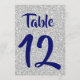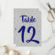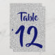 Une élégante carte de table mariage monogramme avec des chiffres bleus royaux sur un effet arrière - plan parties scintillant argent. Le style, la couleur et le placement de la police peuvent également être changés comme vous le souhaitez.