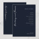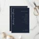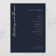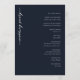 This elegant wedding program features a sophisticated navy blue background with crisp white cursive text for the couple's names, creating a striking contrast. The layout is minimalist and modern, with a clean sans-serif font detailing the ceremony schedule in an organized manner. Ample spacing enhances readability, while the overall design conveys a mood of formality and anticipation, perfect for a memorable wedding celebration. Customizable elements allow personalization, making it ideal for any special occasion.
