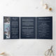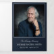 Triple programme funéraire où vous pouvez ajouter plusieurs photos de votre être aimé avec une nécrologie, ordre de service, leur psaume préféré, poème, ou prière, et des remerciements en polices blanches élégantes contre les arrière - plans bleu marine. Dans la mémoire aimante est écrit sur la couverture du programme funéraire photo dans un script élégant. Programme funéraire bleu marine personnalisé avec photo et texte.
