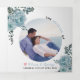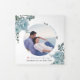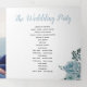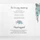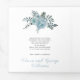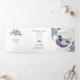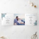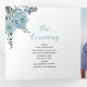 Couleur d'eau bleu poussiéreuse, feuilles et photo Tri-Fold programme de mariage. Un joli design qui présente une photo, des fleurs de cactus bleu poussiéreux et de succulents feuilles sur les coins supérieur gauche et inférieur droit, le texte "Le mariage de" en noir et bleu vos noms et la date du mariage et un coeur rose sur la couverture. Il y a une autre photo à l'arrière du panneau extérieur tandis que les autres panneaux incluent les détails de votre cérémonie et fête de mariage.