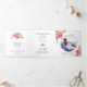 Fleurs d'aquarelle rose, feuilles verts et programme de mariage Tri-Fold photo. Un joli design qui présente une photo, des fleurs de cactus roses et de succulents feuilles sur les coins supérieur gauche et inférieur droit, le texte "Le mariage de" en noir et rose, vos noms et la date du mariage et un coeur rose sur la couverture. Il y a une autre photo à l'arrière du panneau extérieur tandis que les autres panneaux incluent les détails de votre cérémonie et fête de mariage.