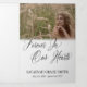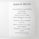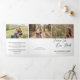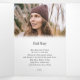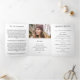 Triple programme funéraire où vous pouvez ajouter quatre photos de votre être aimé avec une nécrologie, ordre de service, leur psaume préféré, poème, ou prière, et des remerciements en polices noires élégantes contre les arrière - plans blancs. Forever In Our Hearts est écrit sur la couverture du programme de photos funéraires dans une belle écriture.