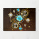 Turquoise lenses with antique watch with brass gears and golden keys on rusty, brown background. Steampunk style.