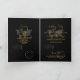 A black and gold destination wedding passport design with gold world map, airplane and travel elements. This design is ideal for all Spring, Summer, Fall and Winter destination weddings. An elegant black and gold wedding travel design with passport layout, world map and custom couple photo. A modern destination wedding order of service program design with elegant elements. Matching wedding invitations and other stationery items are also available.