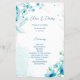 Blue Blossom & Breeze Cette carte de programmes de mariage dégage une élégance douce et apaisante avec son design floral bleu cool. Les fleurs à l'aquarelle s'écoulent gracieusement le long des coins supérieur gauche et inférieur droit, donnant à la carte une sensation délicate et aérée. L’arrière - plan est un subtil lavage de tons bleu pâle, qui rappelle un ciel aquarelle, ce qui améliore l’esthétique douce de la carte. La police de script utilisée pour les noms est à la fois élégante et moderne, tandis que le texte supplémentaire est présenté dans une police serif propre, assurant la lisibilité tout en maintenant la sophistication. Idéale pour un mariage de printemps ou de plage, cette invitation crée une première impression sereine et invitant pour votre journée spéciale. F010