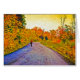 Une femme se promène sur une route bordée d'arbres qui brûlent au feuillage d'automne.