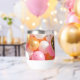A sweet and romantic way to ask a girl or boy to prom! Will you go to prom with me personalized tumbler.. Background is a bunch of gold, white and pink balloons!