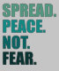 Répandre la paix Pas la peur est une bonne ambiance dont nous devons nous répandre. Que serait le monde sans la paix ? En ayant ce simple design typographique, vous donnez certainement une forte inspiration aux autres pour toujours répandre la paix, pas la peur ou la guerre. Diffusons la paix à travers le thème pacifique de nos t-shirts, sweat - shirts à capuche, tasses, etc.