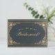 Il a un cadre vintage avec d'élégantes décorations baroques dorées sur un arrière - plan bleu marine foncé. Le mot "Bridesmaid" est écrit dans un élégant script calligraphique. La proposition "Serez-vous mon" est courbée au-dessus, écrite en petits casquettes. Le message au dos est écrit dans le même script d'écriture manuscrite. Tout le texte a une couleur jaune doré. L'arrière - plan avec ses élégantes décorations dorées sur bleu foncé est tiré d'une reliure vintage de couverture de livre français, par Georges Mercier (1885-1939) - Madame de Maupin par Teophile Gautier, volume 1, édition 1911, Paris - maintenant dans le domaine public, de la Bibliothèque publique de New York