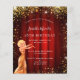 Veuillez noter que cette invitation est sur papier de prospectus et très mince. Les enveloppes ne sont pas incluses. Pour des invitations plus épaisses (même conception), veuillez visiter notre magasin. Une invitation moderne, élégante et glamour pour une fête d'anniversaire du 18ème (ou tout autre âge), Hollywood thème. Un arrière - plan rouge avec de la poussière de parties scintillant en faux or, une fille portant une robe dorée. Un rideau de film rouge en tant qu'arrière - plan Le nom est écrit avec un script de style moderne écrit à la main. Personnalisez et ajoutez les détails de votre fête.