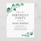 Budget Personnalisez cette Aquarelle Moderne Verdure Eucalyptus Foliage Style Printemps N'importe quel âge fête d'anniversaire Invitation sur arrière - plan blanc avec votre message et détails. Cette invitation élégante comprend un feuillage botanique élégant et moderne avec une typographie stylée est parfait pour Sweet 16, 1er, 21ème, 30ème, 40ème, 50ème, 60ème, 70ème, Anniversaire