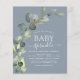 Budget Dusty Bleu Eucalyptus Verdure Aquarelle botanique Succulente Printemps Genre Neutre Bébé Garçon ou Bébé Fille Bébé Sprinkle Douche Invitations sur arrière - plan blanc - comprend belle et élégante typographie script avec feuilles botaniques modernes et la verdure pour la fête spéciale Mère à être.