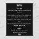 Ce menu élégant et modifiable en noir et blanc propose des options de restauration. Il y a un champ modifiable au verso pour plus d'informations. Changez les détails, ajoutez les prix, changez les catégories, etc. et changez le style, la taille et la couleur de la police. La couleur arrière - plan des deux côtés peut aussi être changée. Utilisez-le pour les mariages, les anniversaires, les retraites, les fiançailles, les anniversaires ou à des fins commerciales comme la restauration, les restaurants, etc. Profitez de votre nouveau Flyer à la carte noir et blanc éditable !