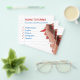 Un modèle de flyer pour un tuteur à domicile avec un texte manuscrit sur du papier ligné avec une main tenant un marqueur rouge et des coches rouges à côté des matières scolaires proposées pour les cours particuliers.